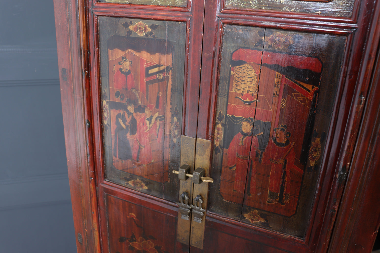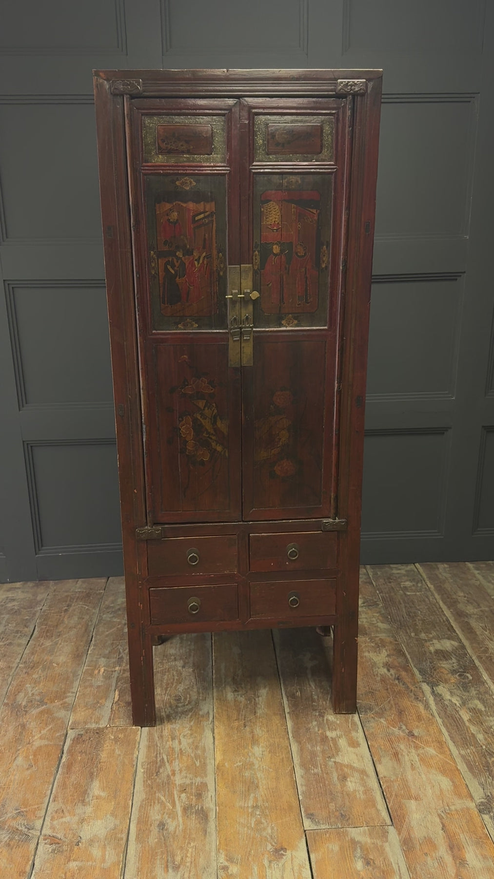A distinctive 19th century Chinese cabinet finished in deep red and black lacquer, featuring painted figural panels to the doors and four drawers arranged below. This tall, architectural piece brings colour, age, and character into any curated interior, making it ideal for a living room, study, or statement hallway setting.