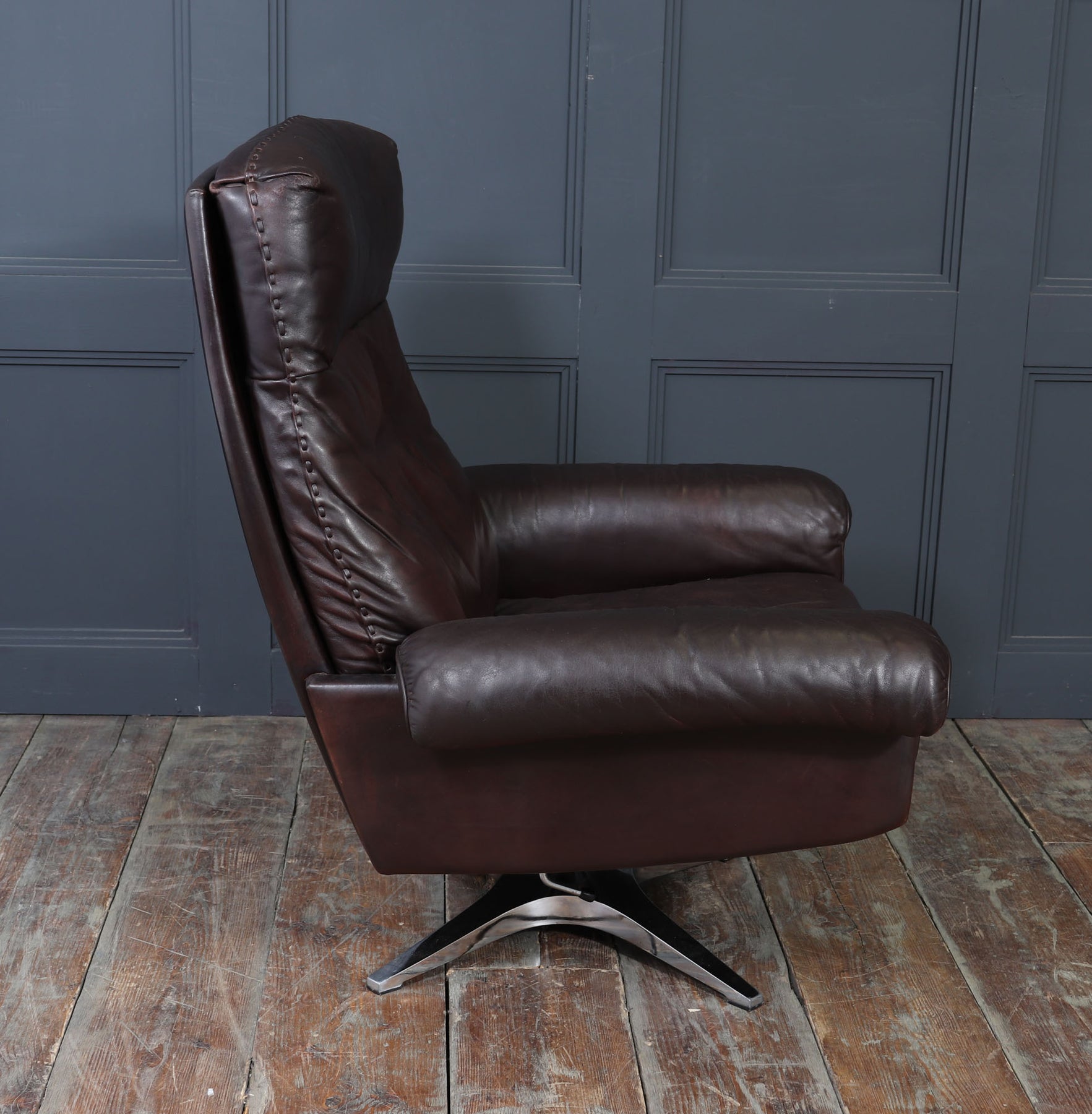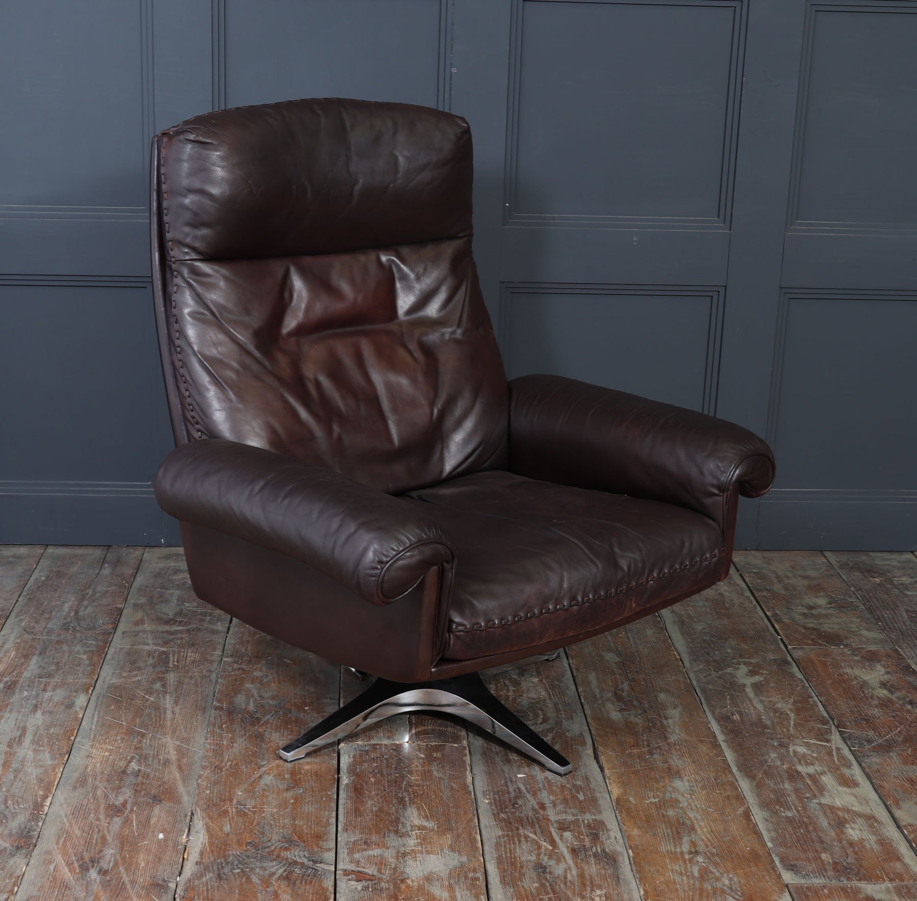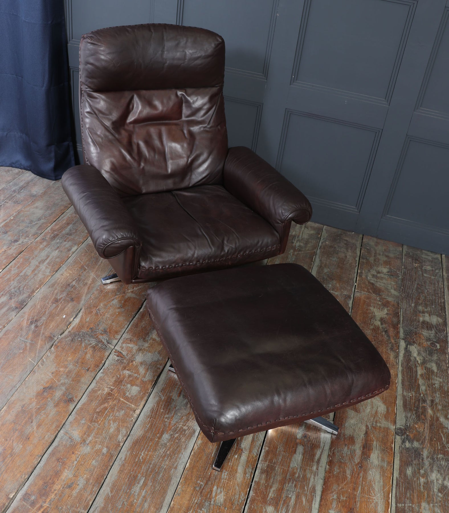 An iconic Swiss design by De Sede, this DS-31 reclining armchair and matching footstool offer the perfect blend of luxury, ergonomics, and timeless style. Upholstered in supple, dark brown leather with a rich patina, the set is supported by star-shaped chrome swivel bases, delivering a distinctive mid-century modern aesthetic.