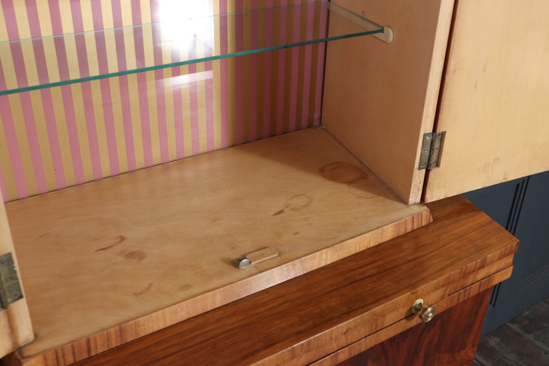 The upper section opens to reveal a mirrored interior backed with striped pink and gold paper, complete with two glass shelves and a chrome cocktail stick holder. A pull-out slide beneath provides a practical surface for mixing drinks. The lower cabinet offers ample bottle storage, including a fitted base with circular bottle recesses and an additional shelf above for glassware.