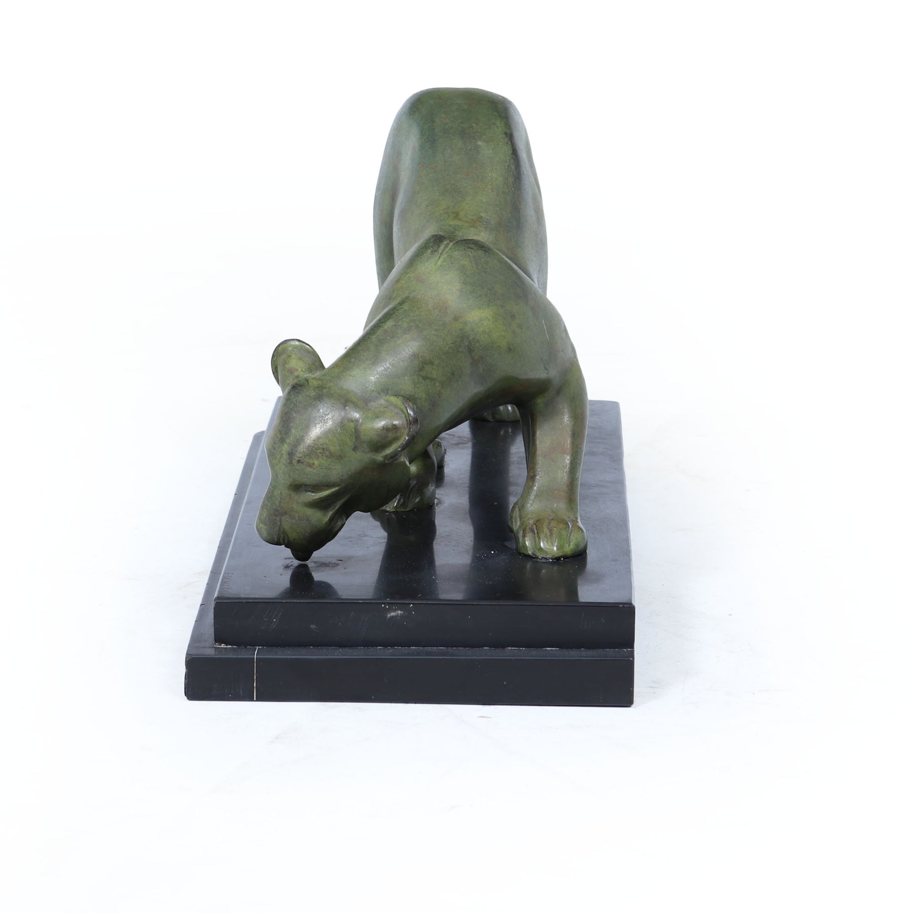 A striking French Art Deco bronze sculpture of a prowling panther by renowned artist Irénée Rochard (1906–1984), dating to the 1920s. Cast in bronze and finished in a rich verdigris green patina, this piece captures the tension and grace of the panther mid-stride with a stylised yet powerful Art Deco silhouette.