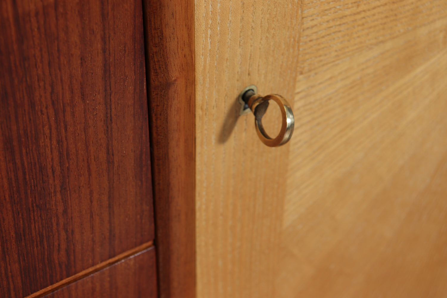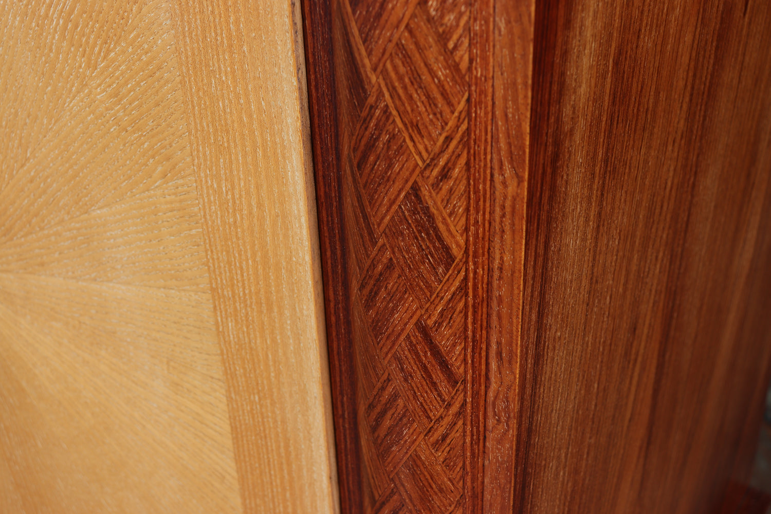 The sideboard features a symmetrical design with a central bank of four drawers, flanked by two large cupboard doors with beautiful radial oak veneer detailing. Both doors retain their working locks and original keys. Each cupboard includes adjustable shelves, providing flexible and practical storage. The fluted parquet columns to either side add a subtle architectural rhythm, complemented by fine brass detailing and sabots.