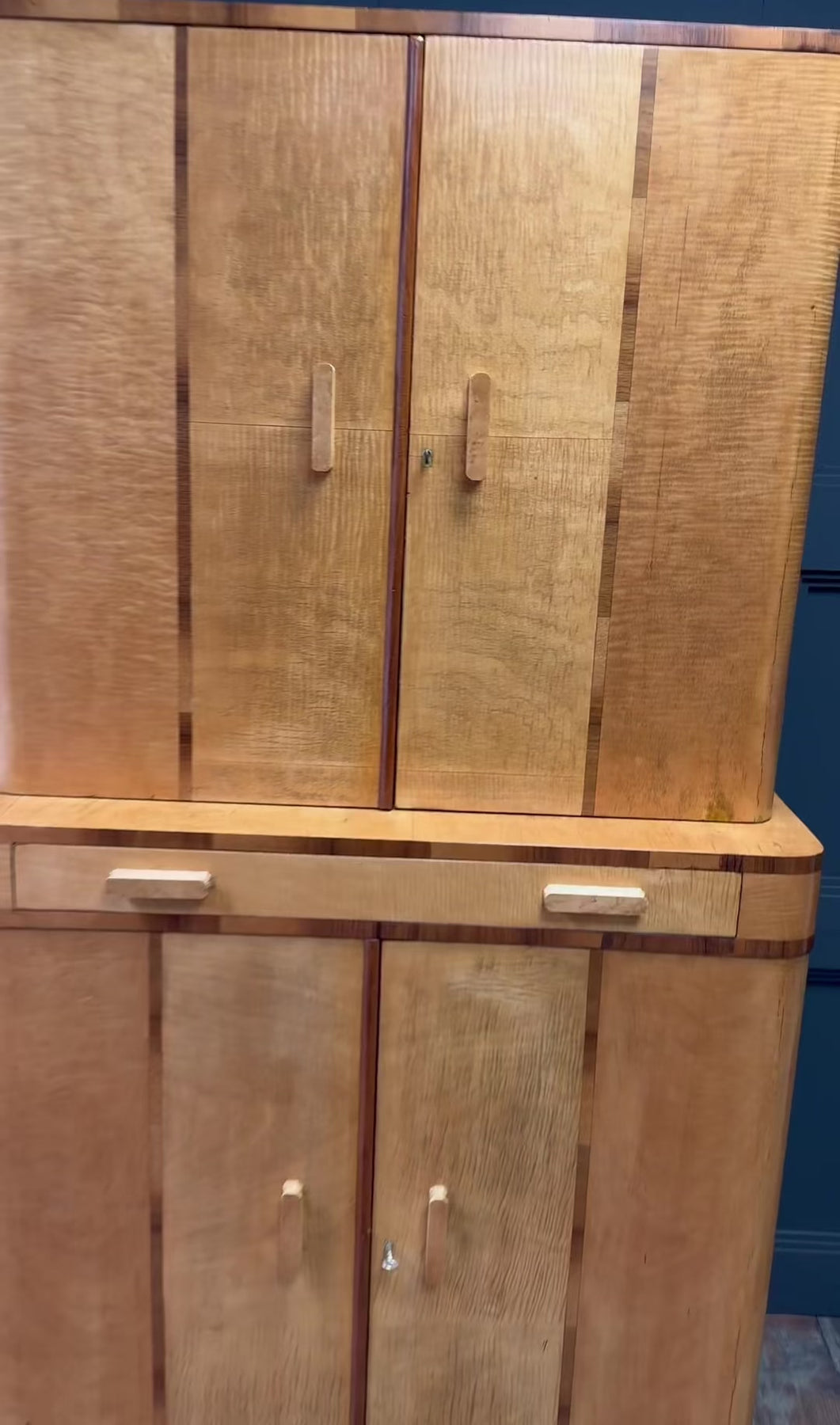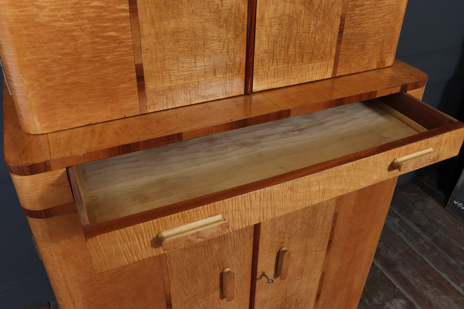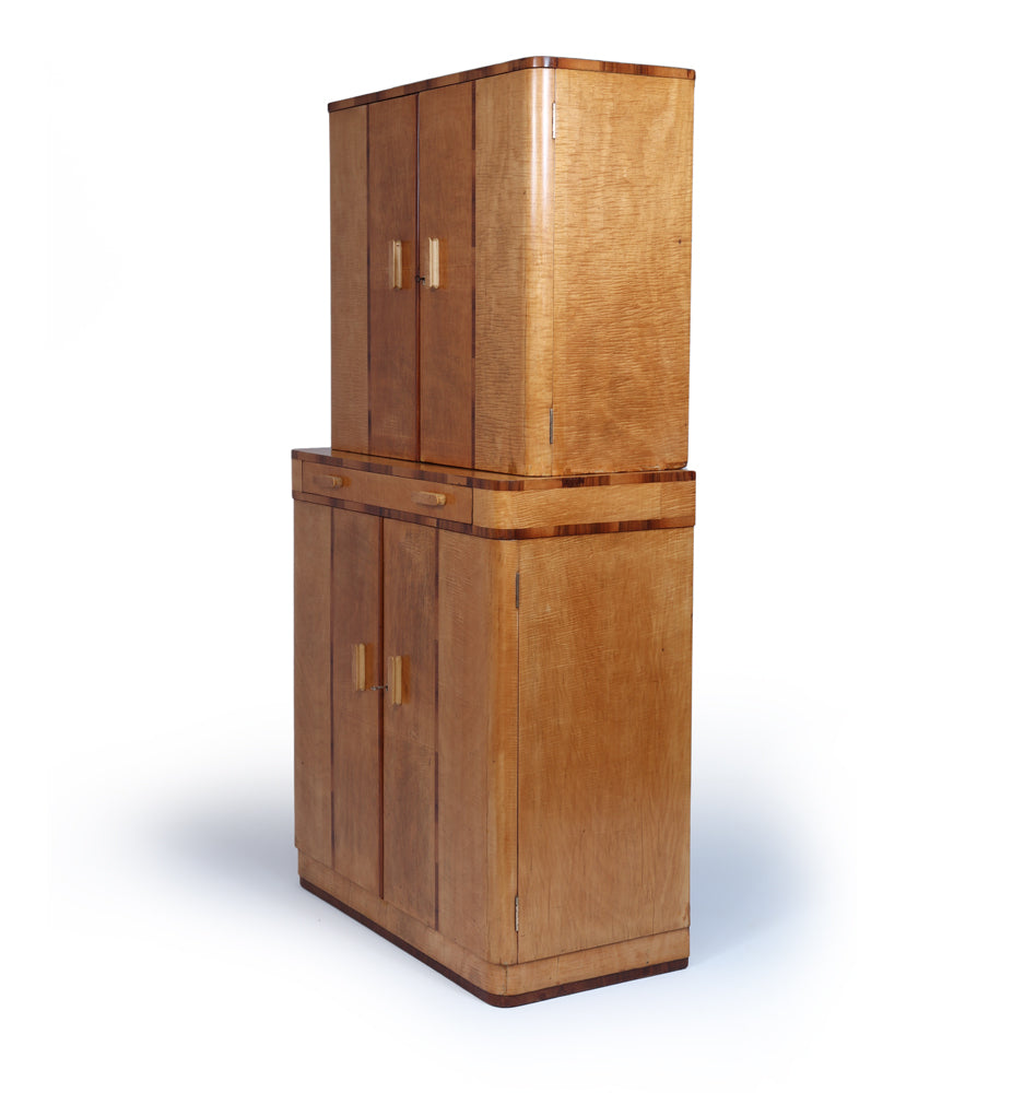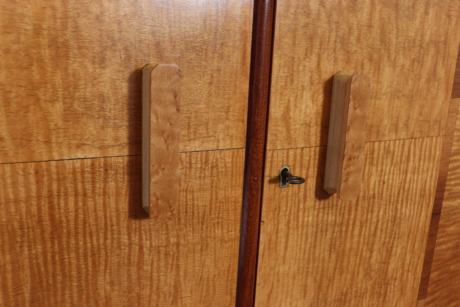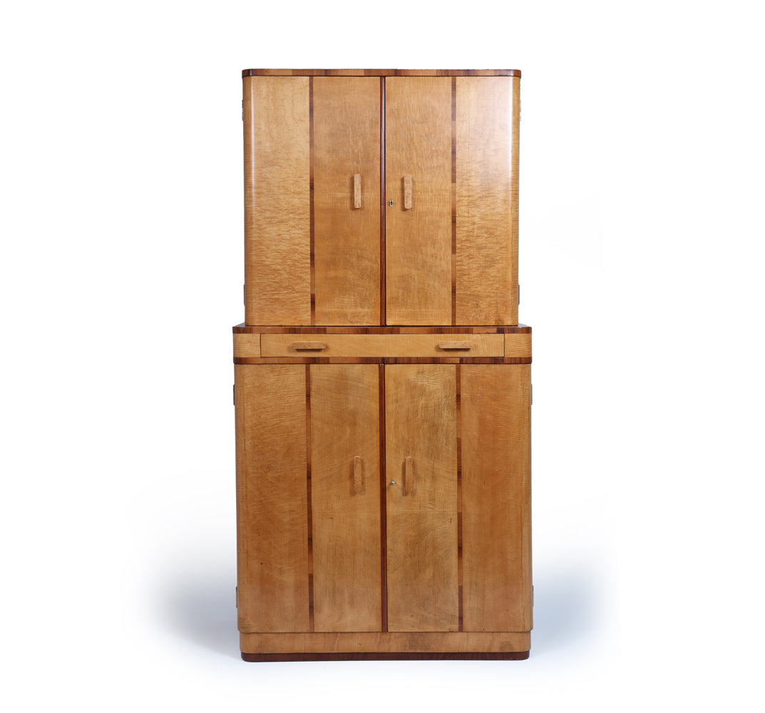 Bird’s-eye maple handles provide a refined tactile contrast against the lighter sycamore ground, while both upper and lower compartments are lockable, with two original keys supplied. The cabinet stands with quiet confidence, its clean vertical lines and refined material palette making it a strong yet versatile piece for a living room, dining room, or interior setting.