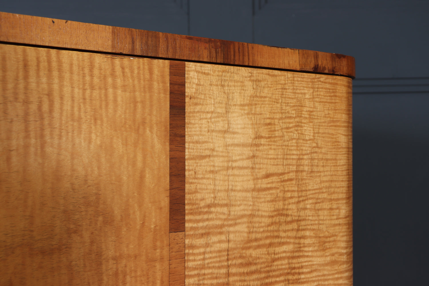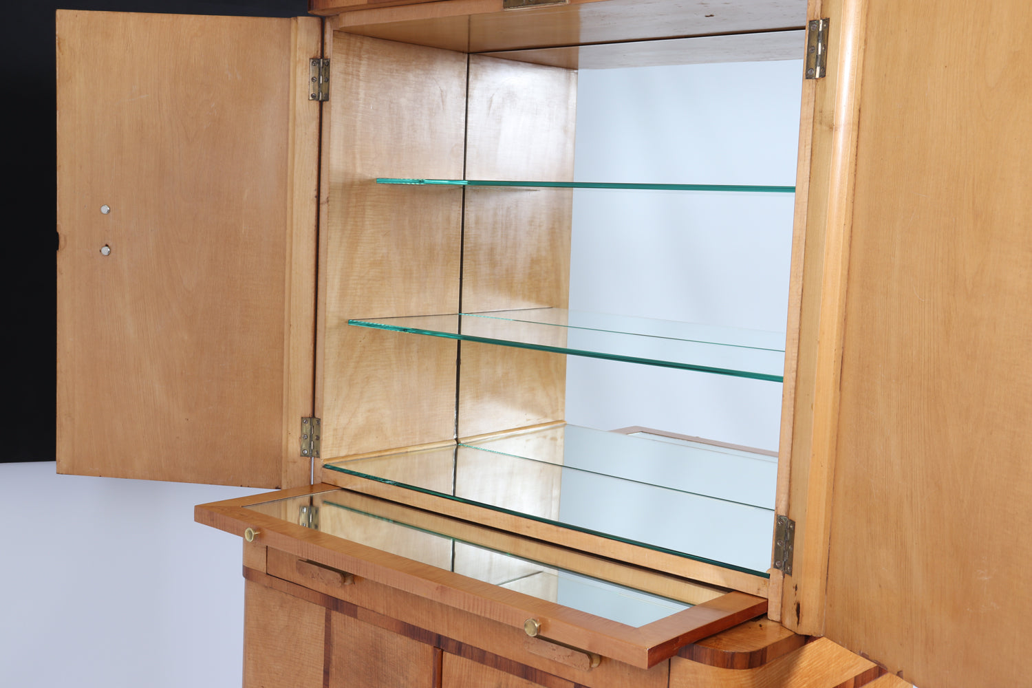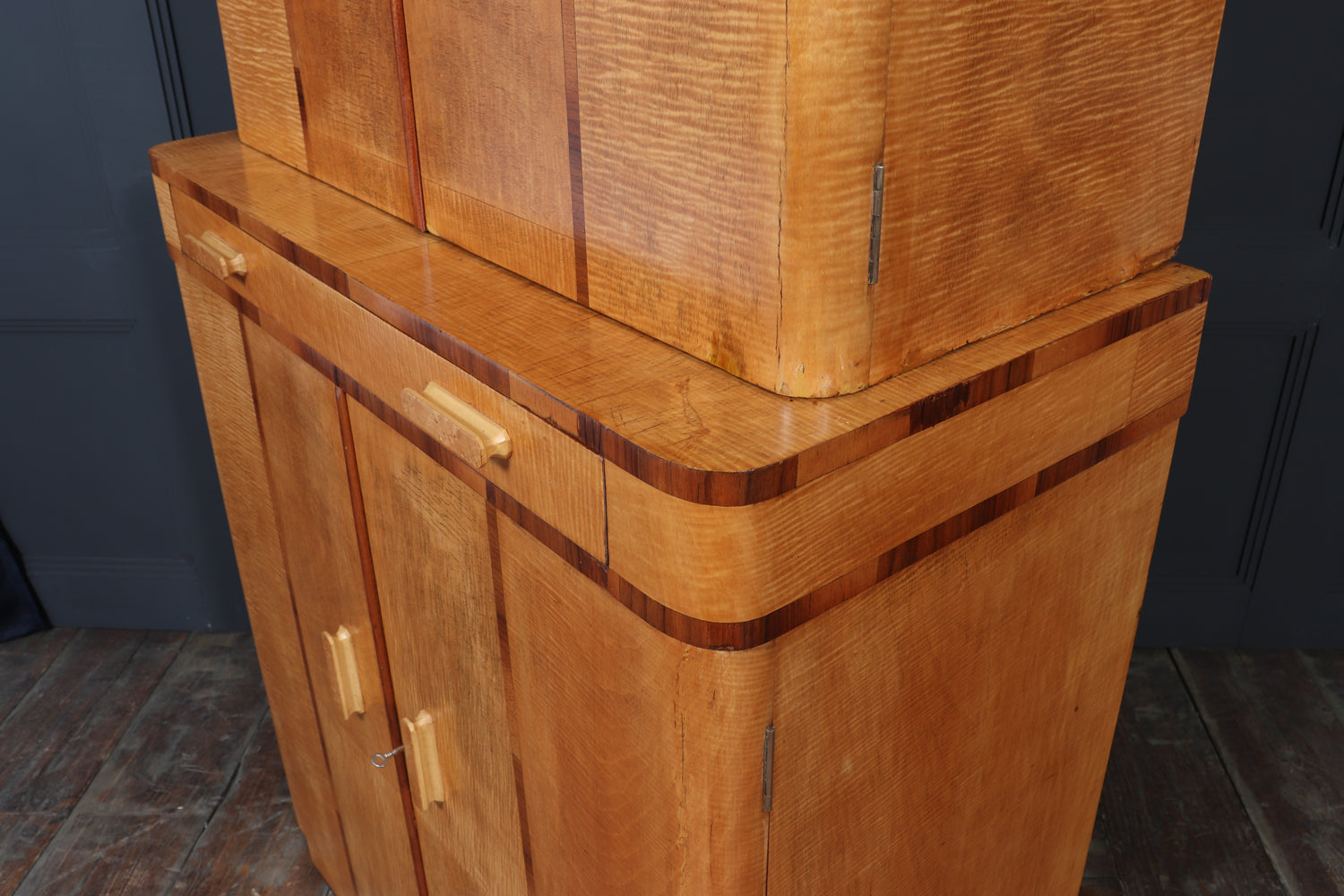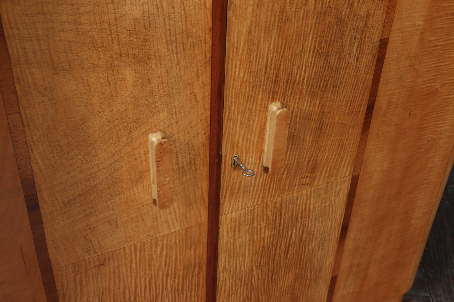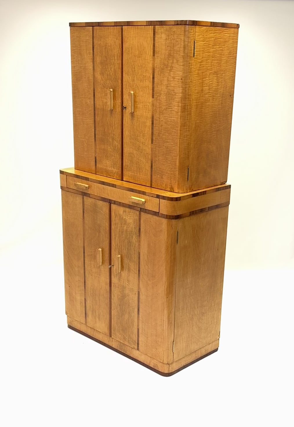 Bird’s-eye maple handles provide a refined tactile contrast against the lighter sycamore ground, while both upper and lower compartments are lockable, with two original keys supplied. The cabinet stands with quiet confidence, its clean vertical lines and refined material palette making it a strong yet versatile piece for a living room, dining room, or interior setting.
