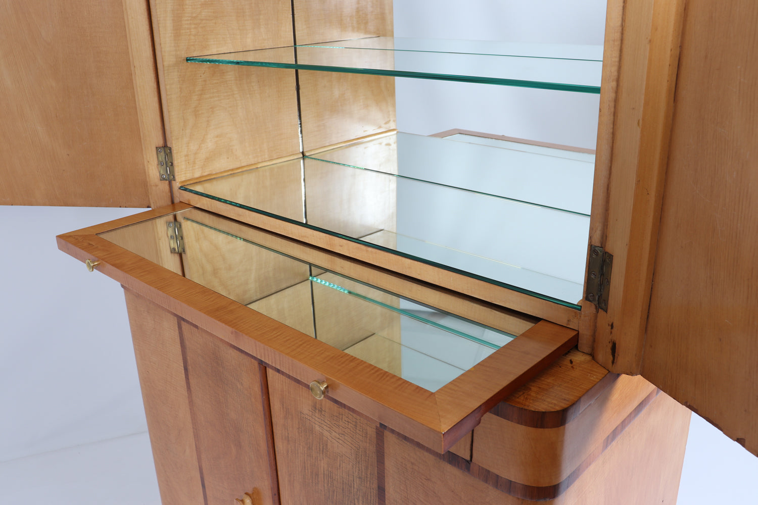 The design is elegantly balanced, with the upper section opening to reveal a glazed interior fitted with glass shelves, ideal for displaying glassware. Behind the upper doors sits a pull-out serving slide with small brass handles, a thoughtful and practical detail typical of the period. The lower section opens to a shelved interior, complemented by a single central drawer, offering additional storage while maintaining visual symmetry.