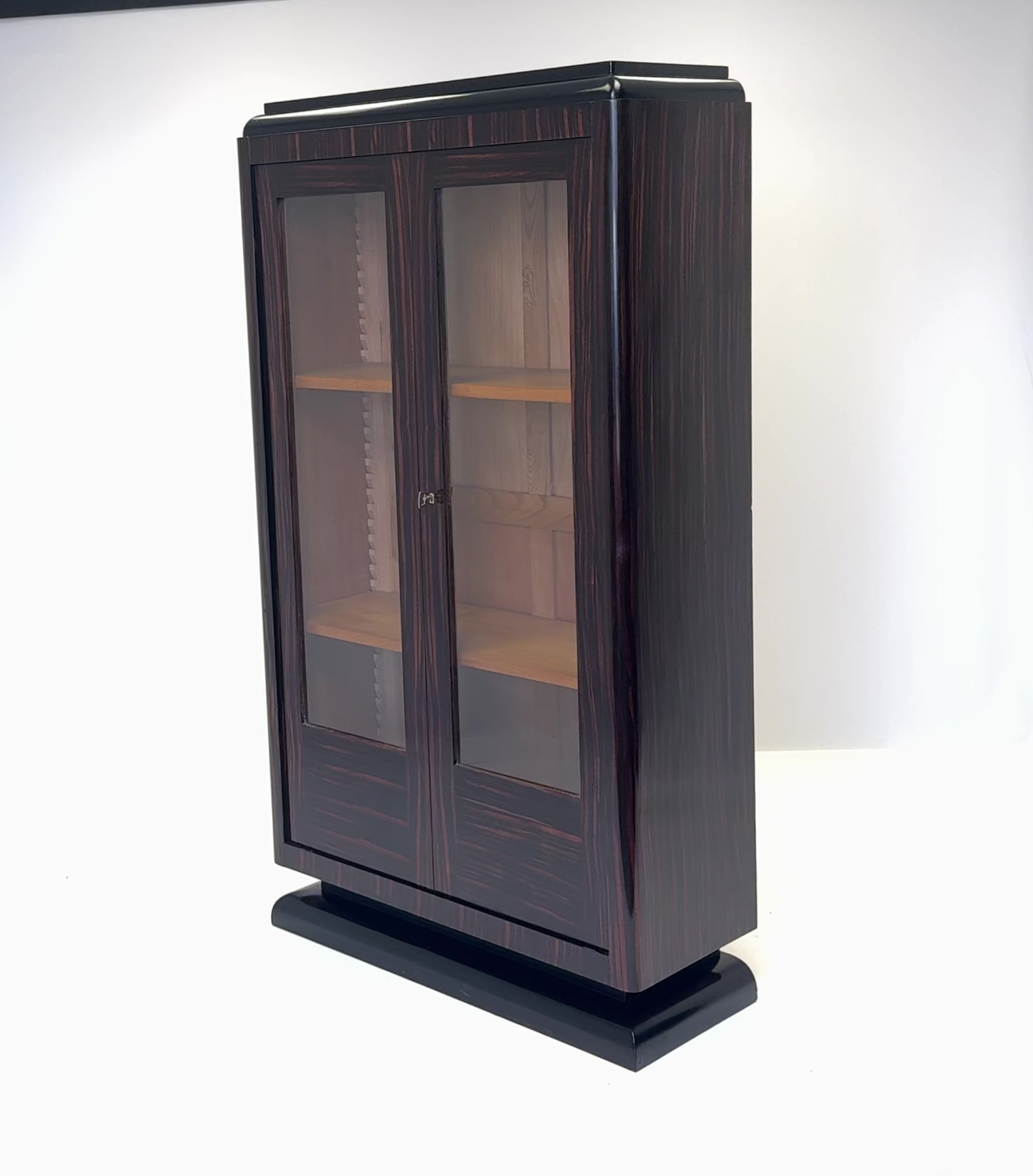 A striking and beautifully proportioned French Art Deco display cabinet, showcasing the dramatic natural striping of Macassar ebony veneer laid over an oak carcass. With its architectural silhouette, softly rounded corners, and rich contrast between the figured timber and deep ebonised detailing, this is a superb example of refined 1930s craftsmanship.