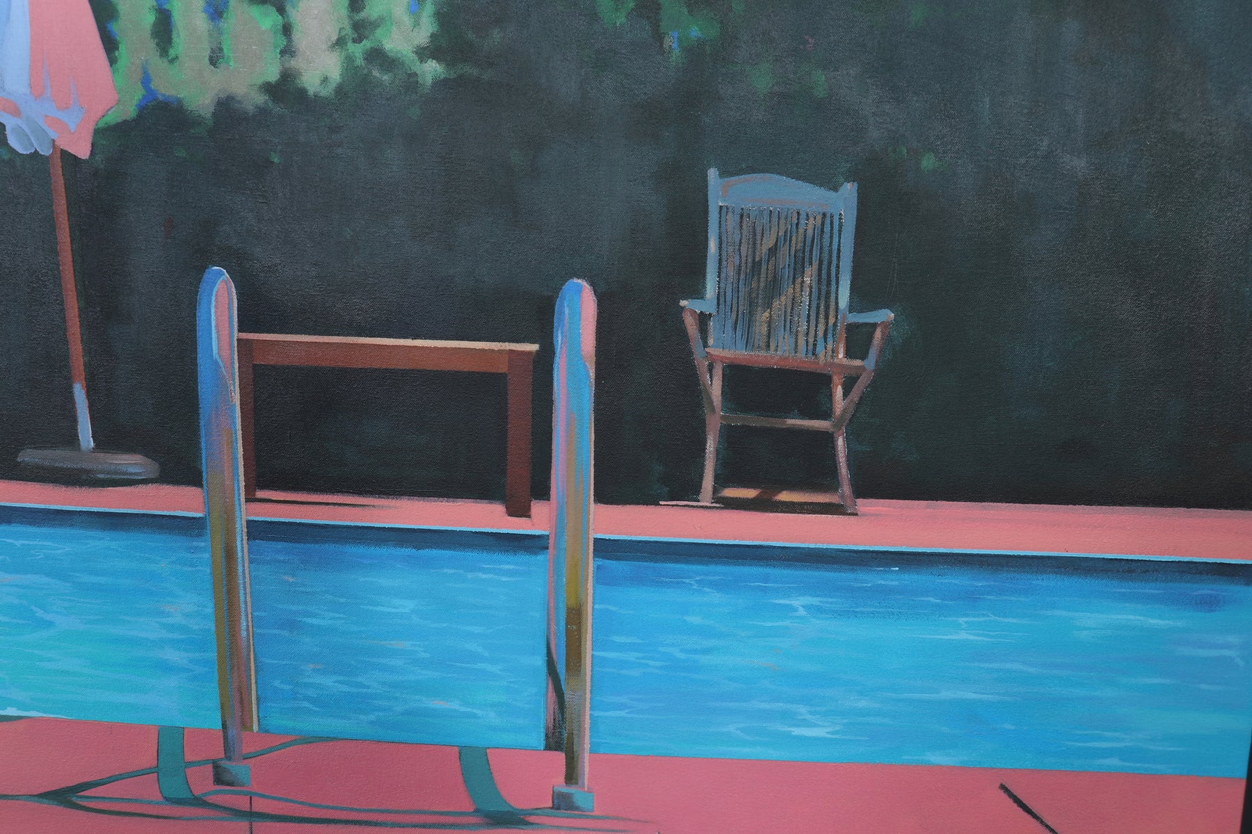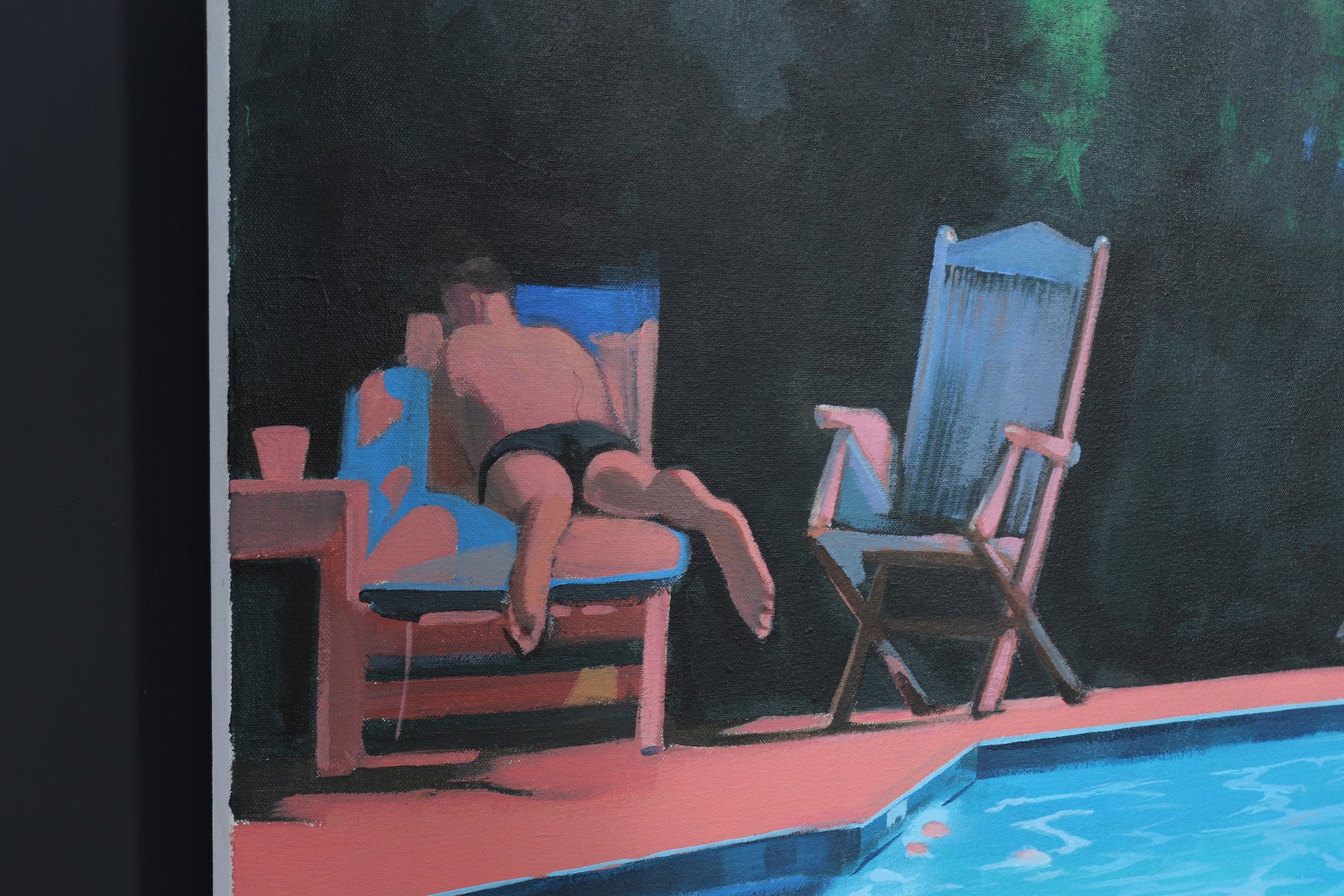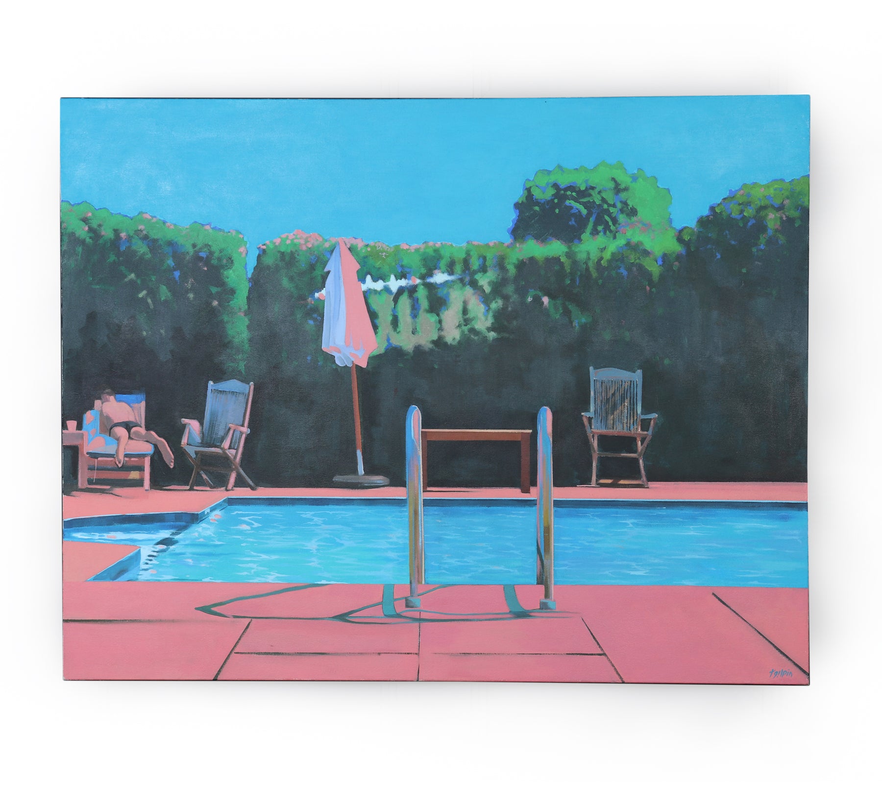 Executed in a confident modern style with strong planes of colour and clean architectural lines, the work evokes the timeless glamour of mid-century resort living. The contrast between the cool blues of the pool and the saturated pinks of the terrace creates a striking visual balance, making the piece an eye-catching focal point for a stylish interior.