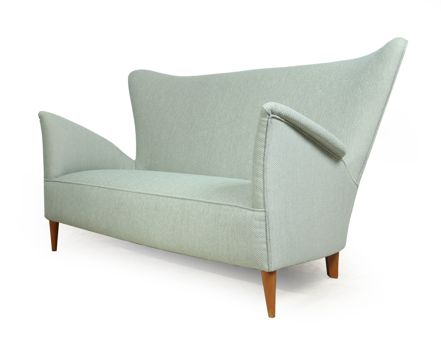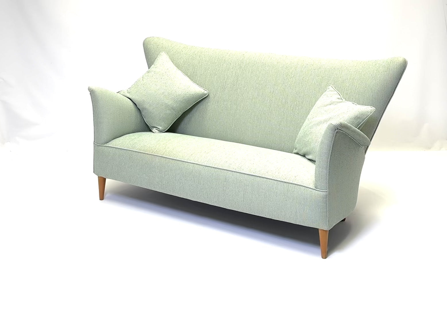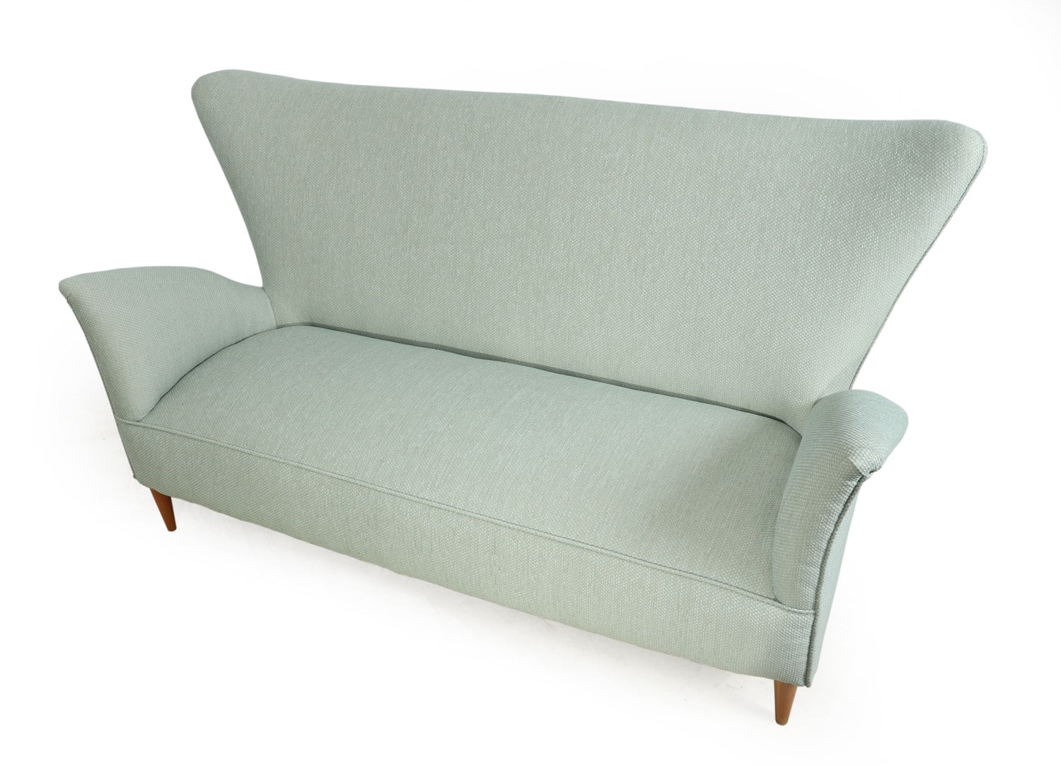 An exceptional 1950s Italian sofa designed by Gio Ponti for the Hotel Bristol, Murano. This beautifully proportioned piece captures Ponti’s distinctive sense of balance between architectural form and comfort, with a high sculpted back, flared arms, and elegantly tapered beech legs. Newly upholstered in soft mint green fabric, it presents a graceful silhouette that feels both modern and timeless. With a solid frame, generous seating, and two matching scatter cushions, the sofa brings understated luxury and character to a refined living room or mid-century interior.