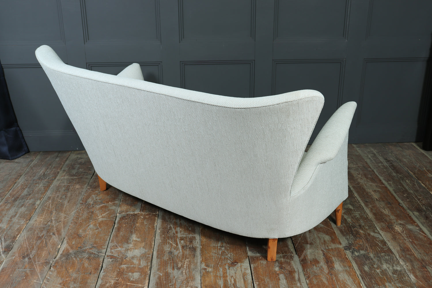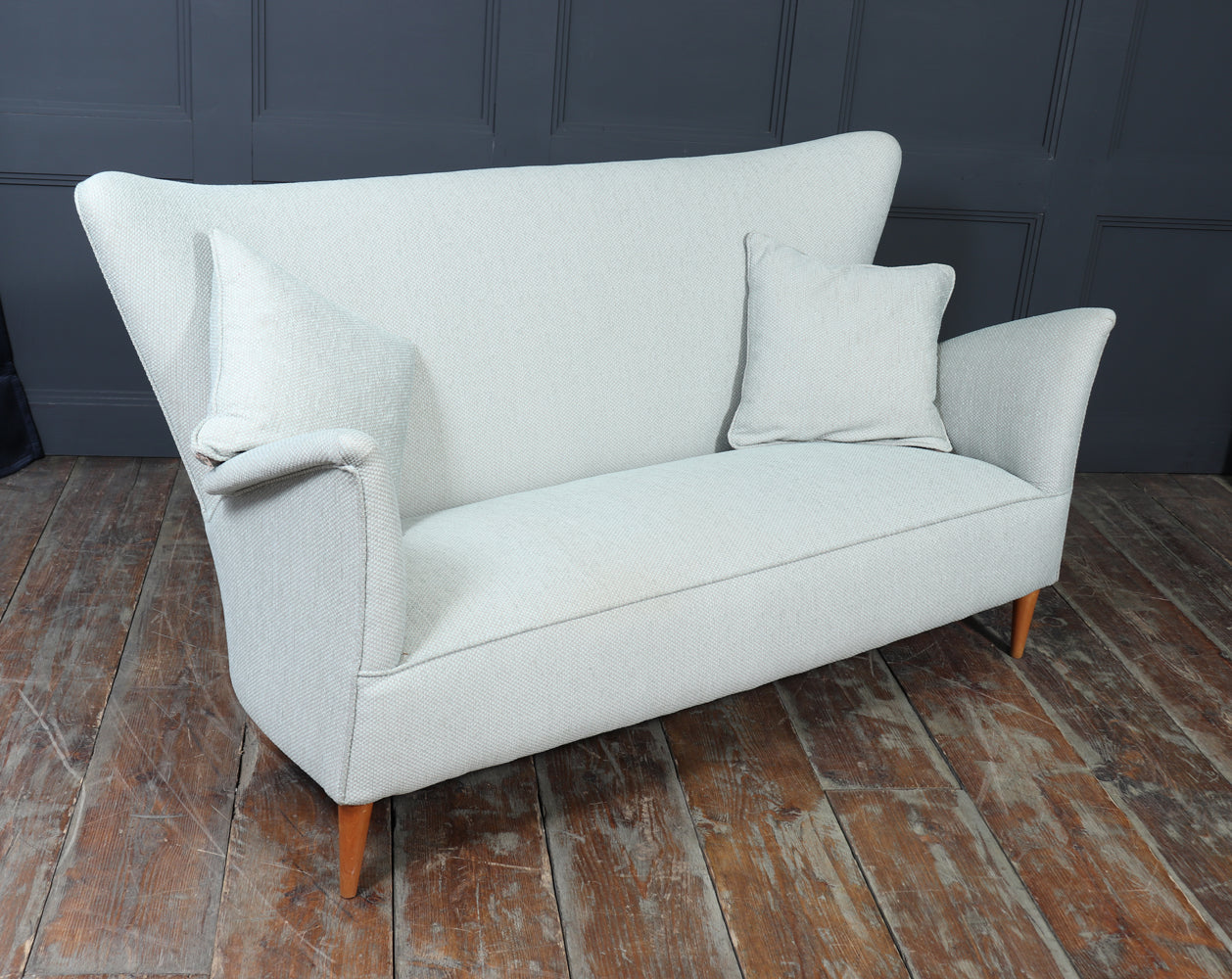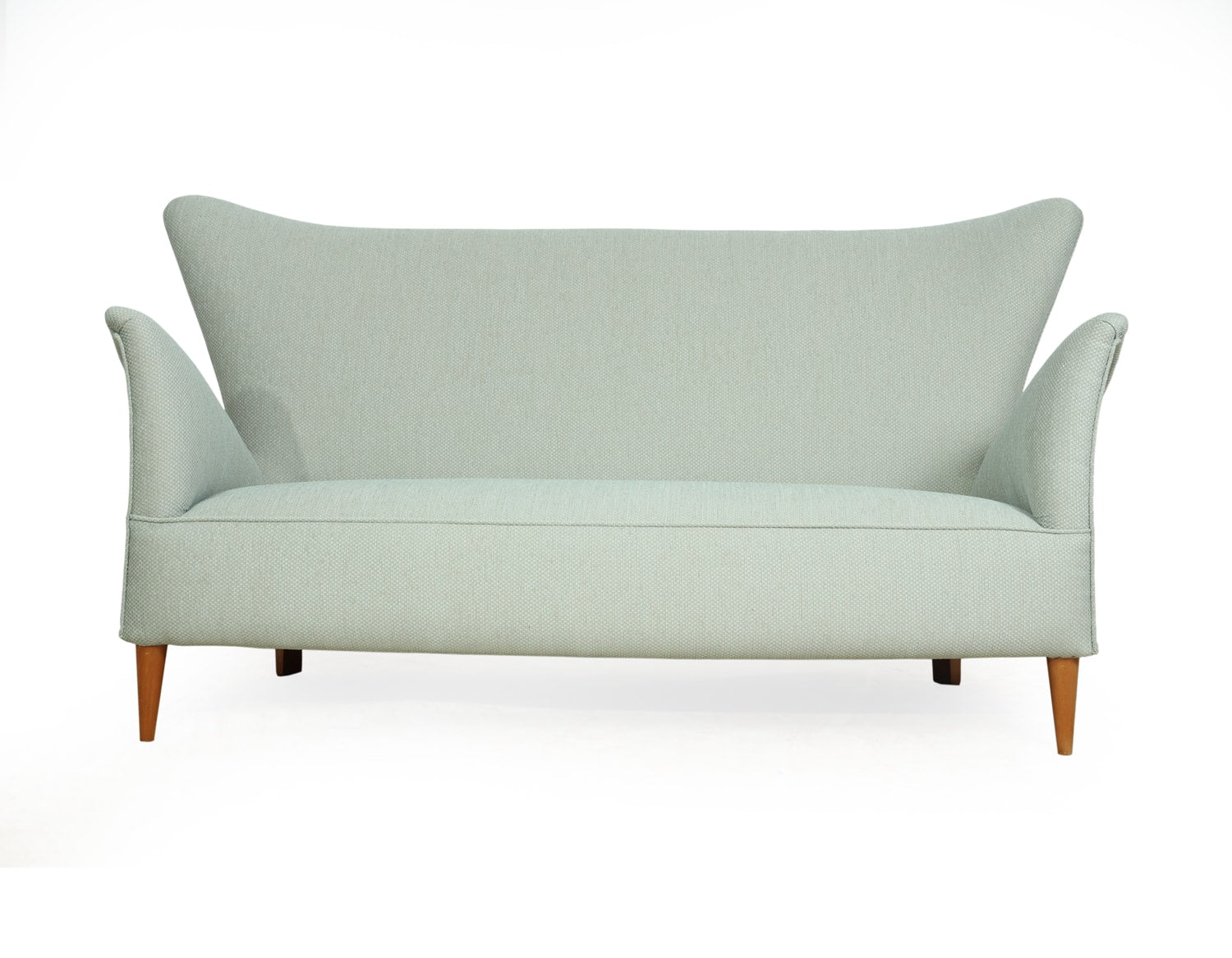 An exceptional 1950s Italian sofa designed by Gio Ponti for the Hotel Bristol, Murano. This beautifully proportioned piece captures Ponti’s distinctive sense of balance between architectural form and comfort, with a high sculpted back, flared arms, and elegantly tapered beech legs. Newly upholstered in soft mint green fabric, it presents a graceful silhouette that feels both modern and timeless. With a solid frame, generous seating, and two matching scatter cushions, the sofa brings understated luxury and character to a refined living room or mid-century interior.
