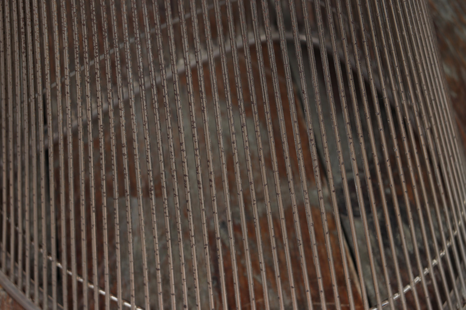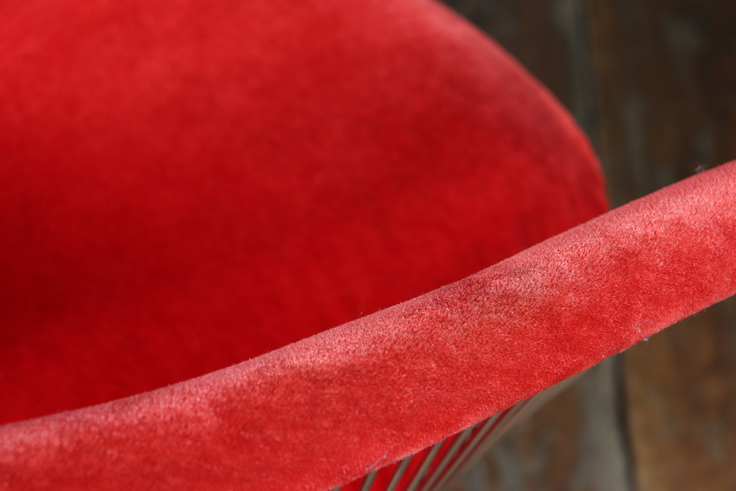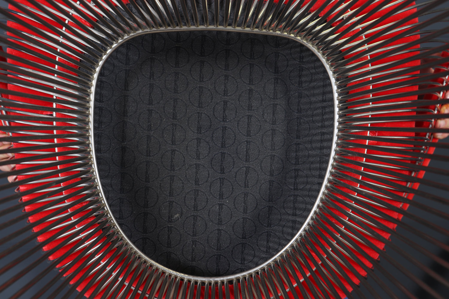 An iconic set of four Warren Platner dining armchairs for Knoll, designed in the 1960s and instantly recognisable for their sculptural elegance and architectural presence. Each chair is crafted from hundreds of curved nickel-plated steel rods, welded with precision to create a seamless, flowing form that blurs the line between furniture and art. The seats retain their original Knoll fabric, identifiable by the classic Knoll logo beneath, presented here in a vivid red upholstery that contrasts beautifully with the cool metallic structure.