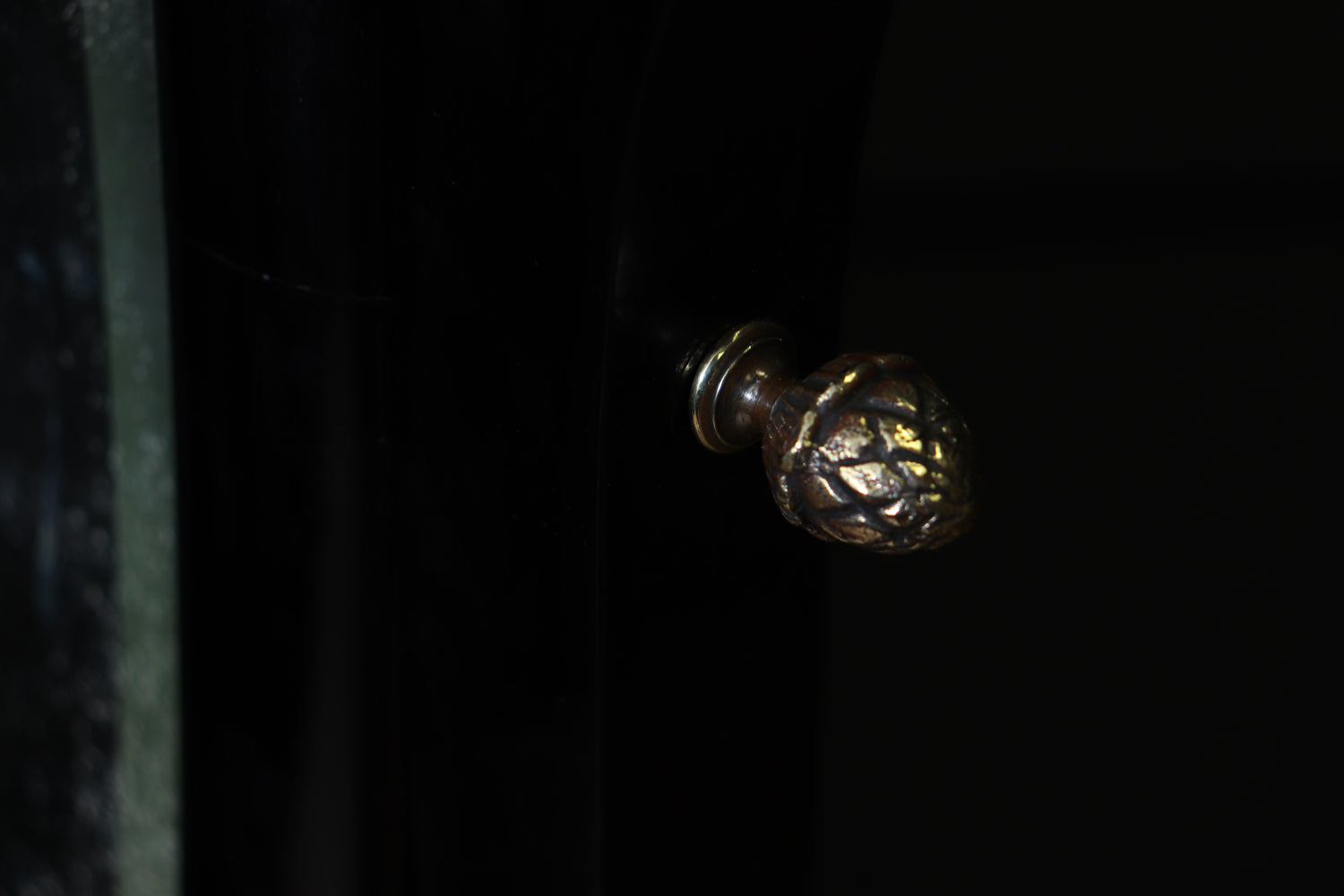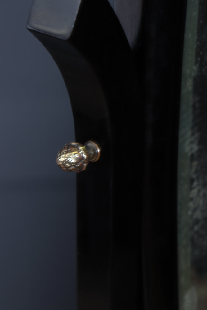 The mirror is adjustable, secured by a pair of attractive brass acorn finials, which allow the angle to be set easily while introducing a subtle decorative note. The contrast between the warm brass fittings and the deep black ebonised finish is particularly effective, reinforcing the confident, sculptural quality of the design.