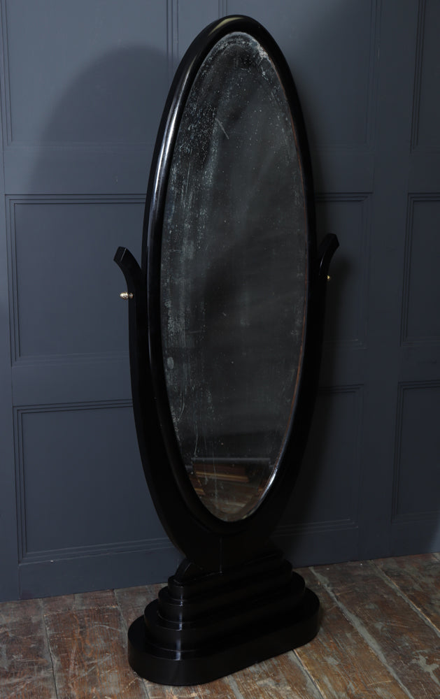 A striking French Art Deco cheval mirror, freestanding and beautifully proportioned, featuring an elegant oval mirror plate held within a bold ebonised wooden frame. The silhouette is classic to the period, combining strong architectural lines with refined curvature, all anchored by a substantial stepped base that gives the piece real presence and stability.