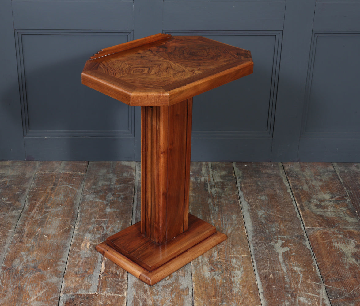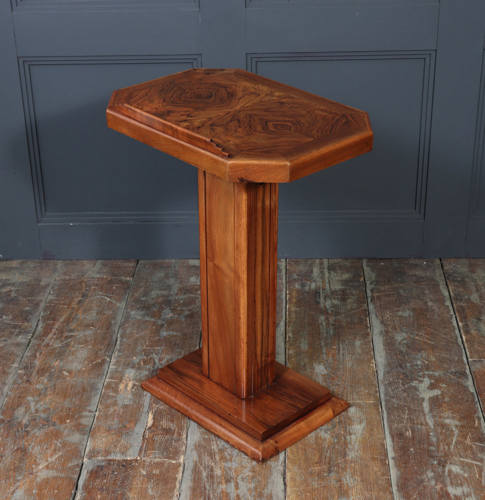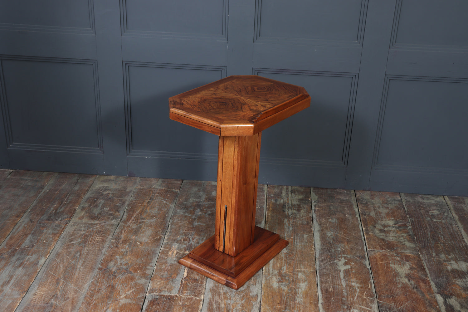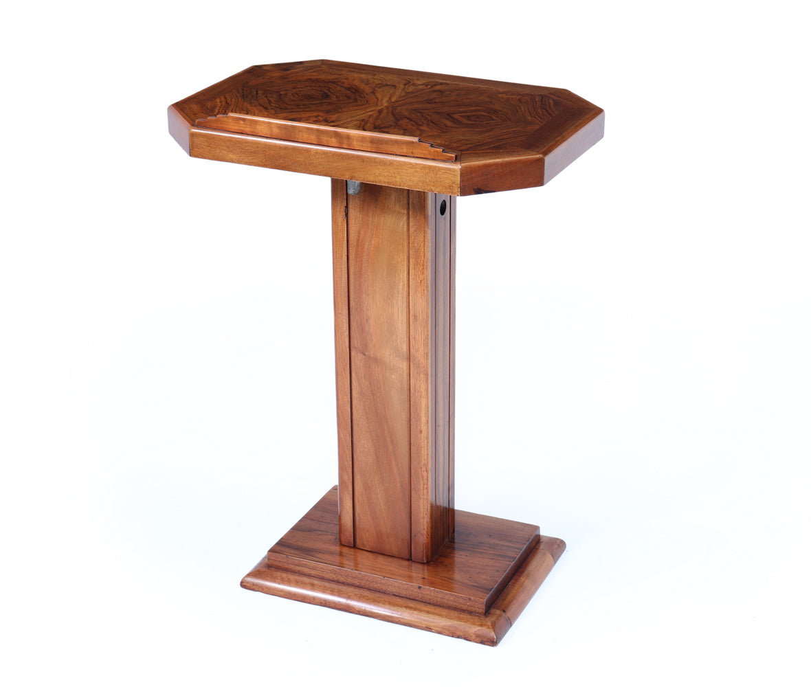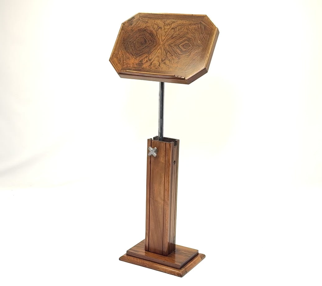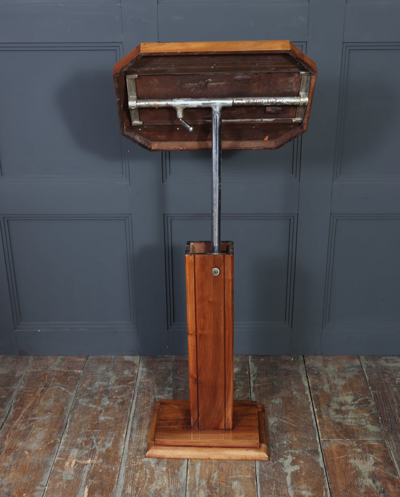 A distinctive Art Deco adjustable music stand, designed to hold written sheet music while playing and notable for its clever, well-engineered functionality combined with refined period style. The octagonal top is beautifully figured, with a shallow lip to support music sheets, and is mounted on a sliding mechanism that allows the surface to move smoothly to the side — an unusual and highly practical feature when seated or standing at an instrument.