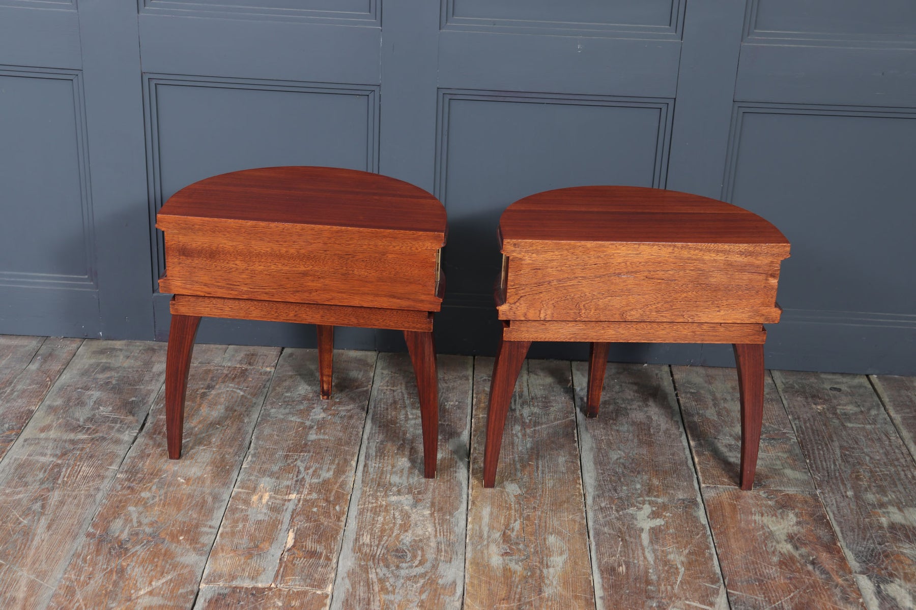 An exceptional pair of French Art Deco side cabinets in  Indian rosewood, dating to the 1930s. Very much in the manner and quality of Jules Leleu, With their demi-lune form, elegant tapering legs, and refined brass-capped feet, these cabinets are as sculptural as they are functional.