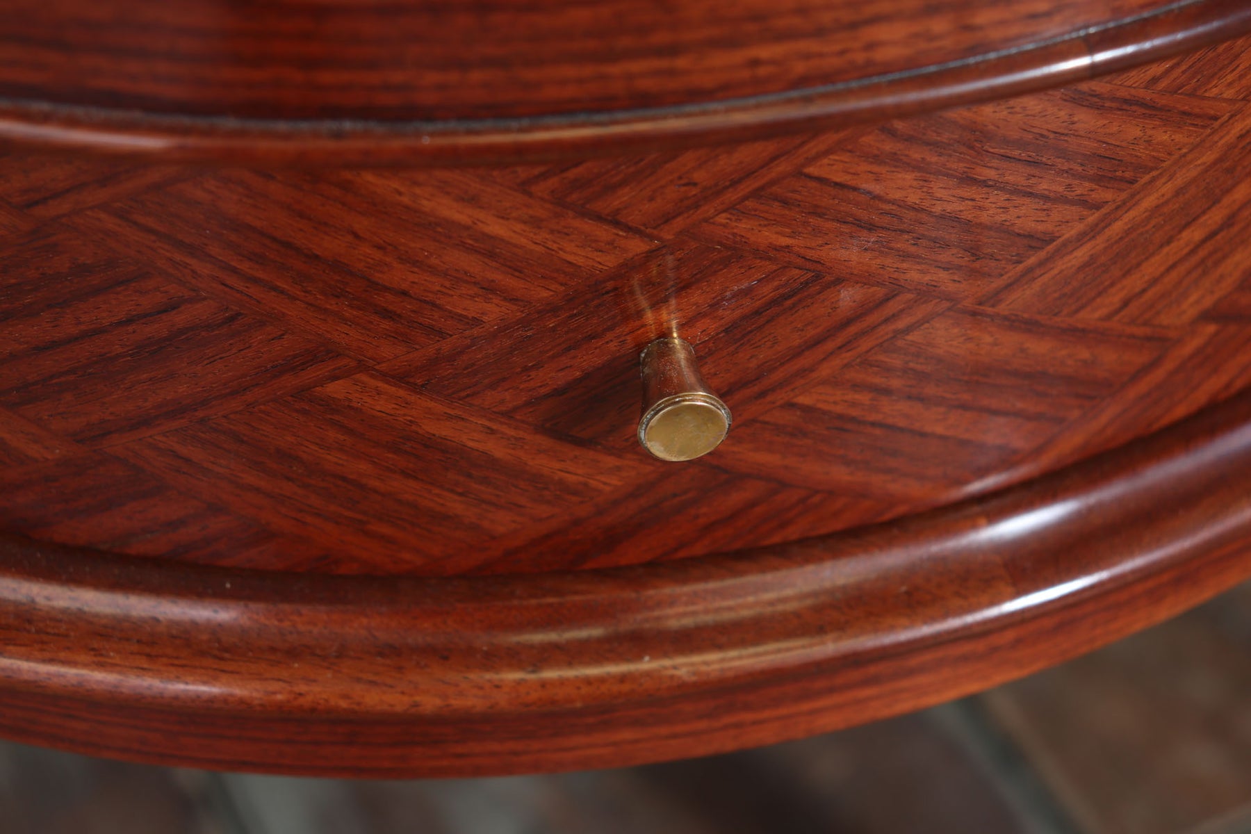 Each piece features beautifully constructed parquetry drawer fronts with a rich, lustrous finish. The drawers open via discreet brass pulls on a clever side-hinged mechanism, swinging outward from the centre — a refined and rarely seen design detail that speaks to the craftsmanship of the period.